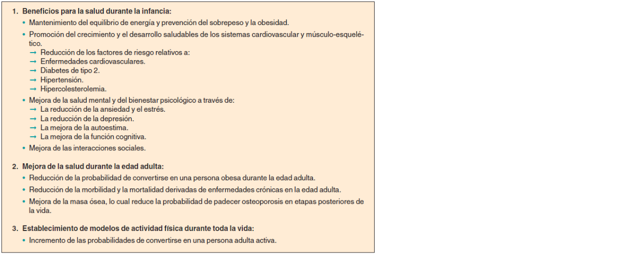 Huesos fuertes, buen tono muscular y menor riesgo de desarrollar enfermedades crónicas son algunos de los beneficios clave derivados de la actividad física regular. Además, la actividad física promueve el bienestar psicológico y reduce los sentimientos de depresión y ansiedad. De acuerdo con los Centros para el Control y la Prevención de Enfermedades, División de Salud Escolar y Adolescente (Centers for Disease Control and Prevention/Division of Adolescent and School Health), el 77 por ciento de los niños de 9 a 13 años de edad hacen actividad física en su tiempo libre y sólo el 39 por ciento se compromete con actividad física organizada. En el caso de los alumnos de escuelas secundarias, el 63 por ciento realizan actividad física fuerte y sólo el 25 por ciento se comprometen en suficiente actividad física moderada. El 12 por ciento hacen poca o ninguna actividad física.